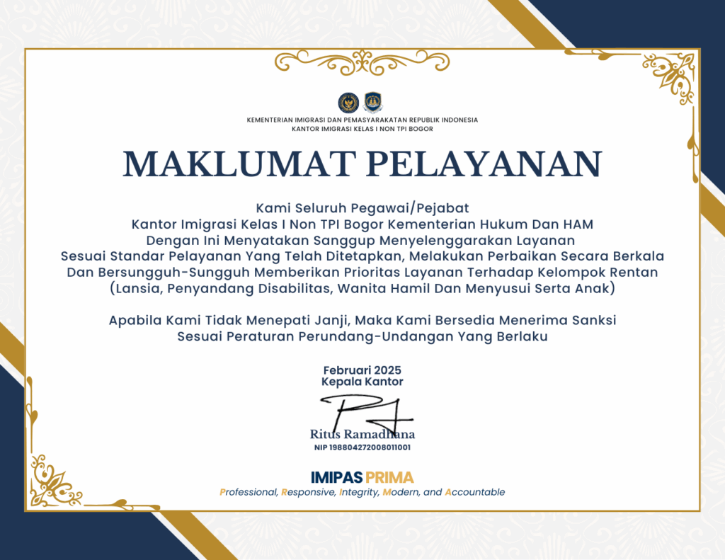 Kami berharap keberadaan situs ini dapat memberikan manfaat yang luas, serta mampu menjawab kebutuhan masyarakat akan informasi penting seputar pelayanan di Kantor Imigrasi Kelas I Non TPI Bogor, sehingga harapan publik terhadap transparansi dan kualitas pelayanan dapat terpenuhi dengan baik.